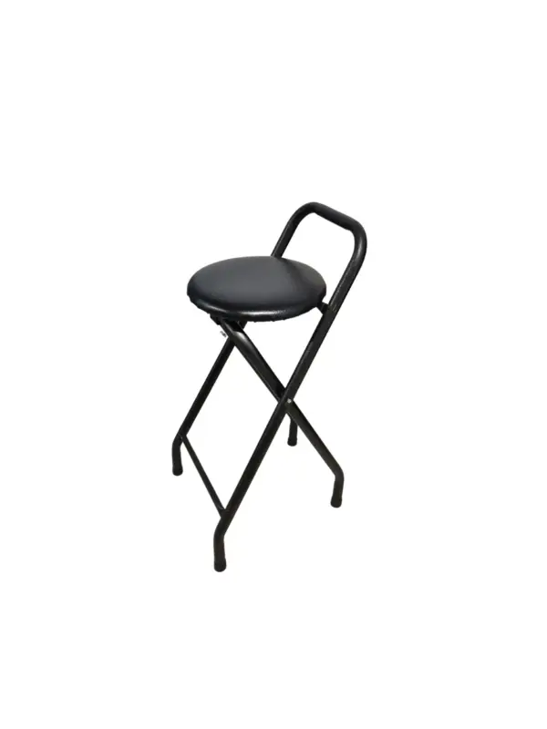 Inklapbare barkruk en met een zwarte kleur skai als zitting. Grijs-hamerslag gelakt onderstel. Van zitting tot grond uitgeklapt 80 cm.