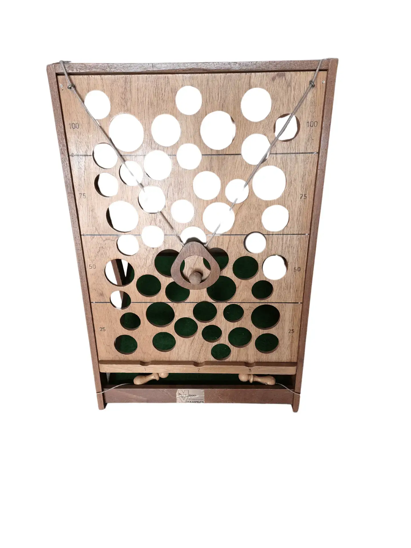 Uitleg Kazenspel: Dit spel wordt gespeeld met 2 spelers. Leg de kogel in de ring en probeer door voorzichtig aan de touwtjes te trekken de bal zo hoog mogelijk voorbij de gaten te krijgen. Je mag 3 x proberen om zoveel mogelijk punten te behalen. De beide spelers hebben uiteraard een gelijk aantal punten.