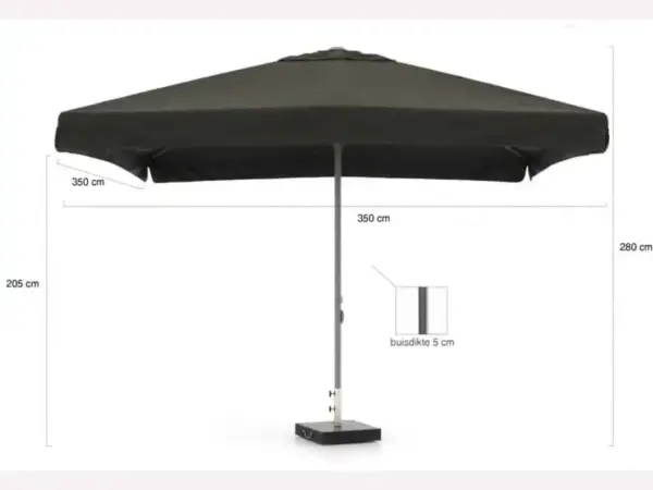 Wij adviseren de parasol 3.50 x 3.50 mtr incl. voet bij wind in te klappen, ook wanneer de parasol niet gebruikt wordt. Dit om de kans op windschade te verkleinen.